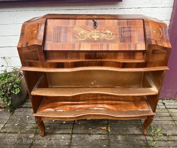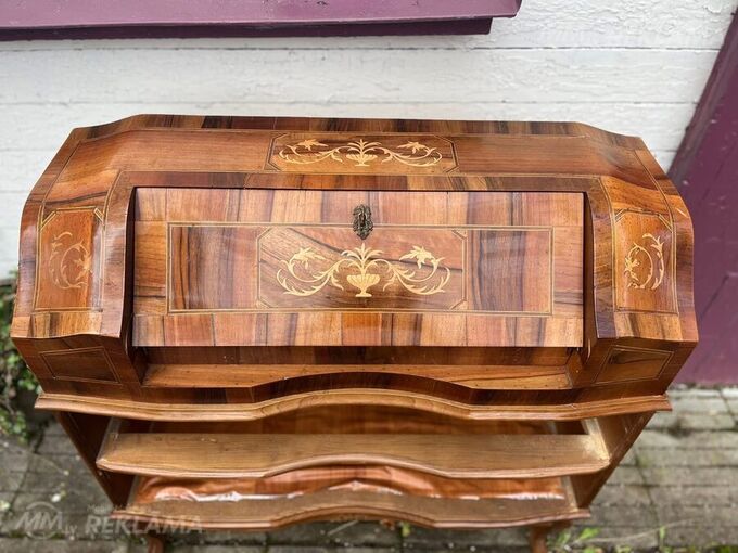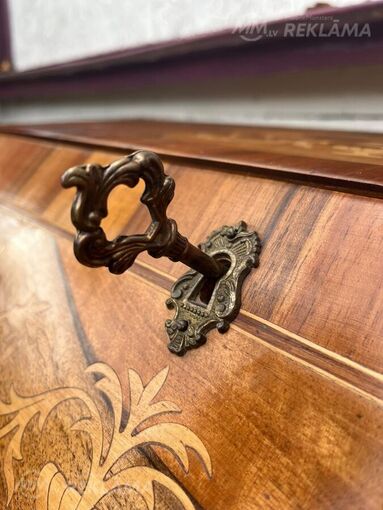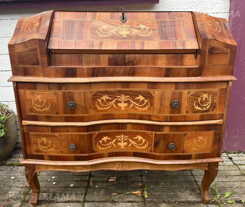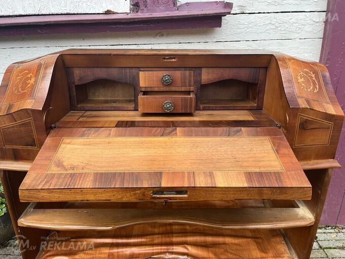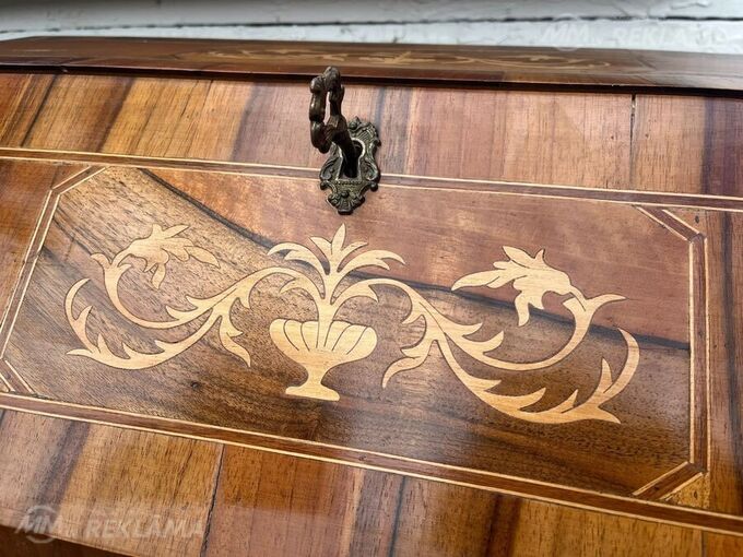 Pārdodu kumodi/sekreteriātu ar inkrustāciju. Var izmantot kā rakstāmgaldu vai arī dāmu galdu. Izmērs:H-0.94/0.90/0.40 Cena-150€ Iespējsms vienoties par piegādi Atrodas Jūrmalā,Dubultos