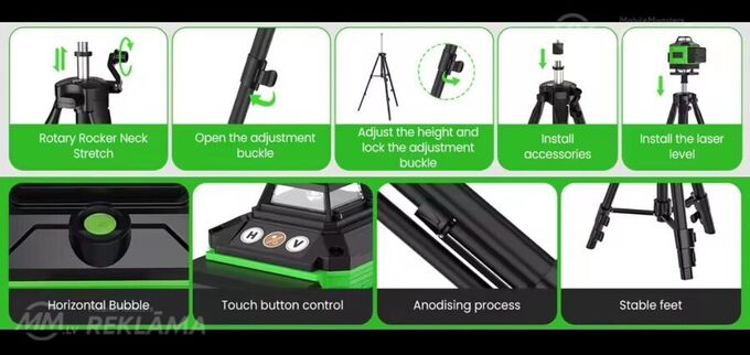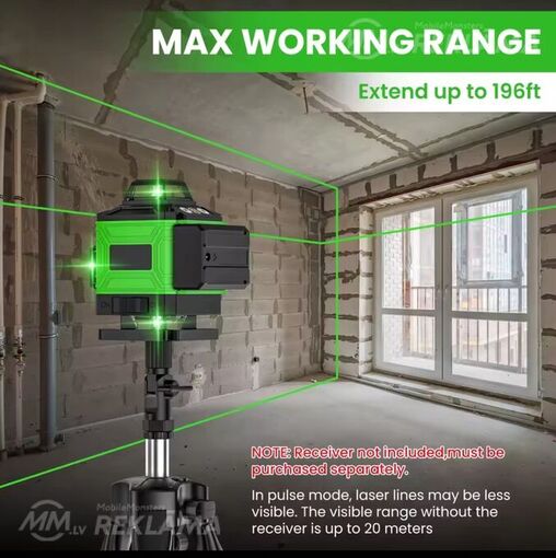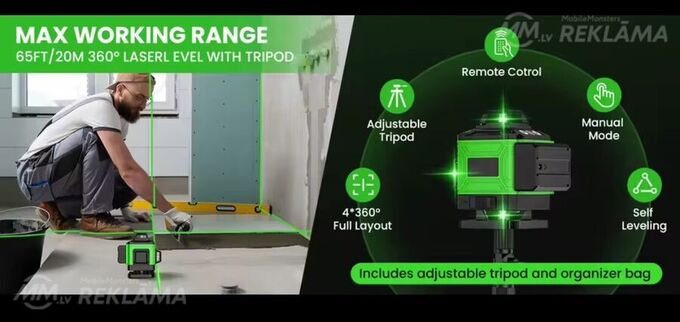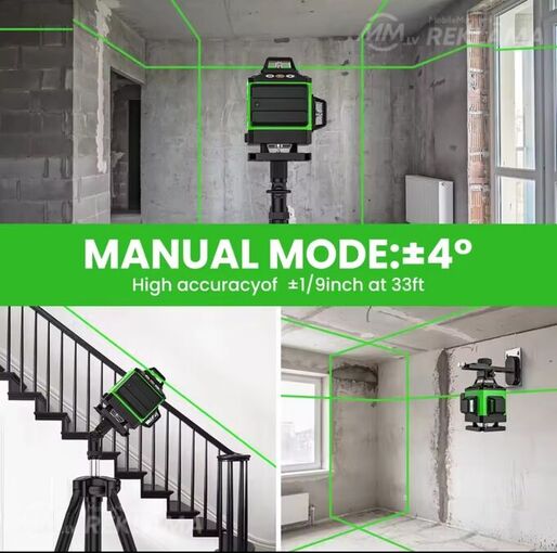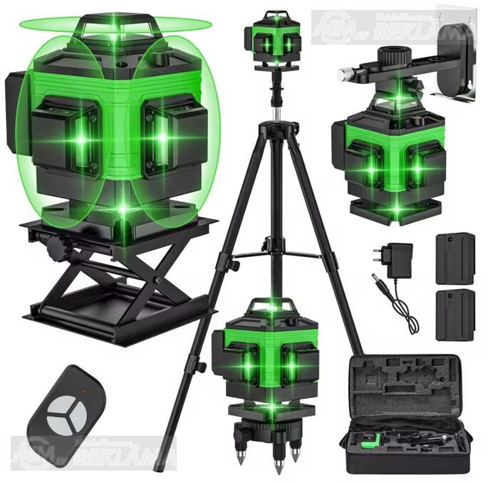 līmenis 4d 16līnijas, 360 grādi, pašizlīdzinošs, skaņas signāls novirzoties no horizontālā, zaļš stars