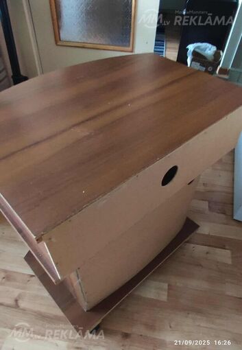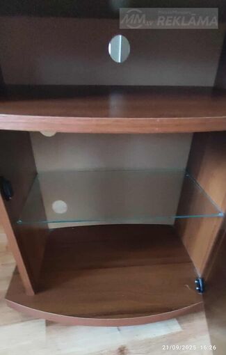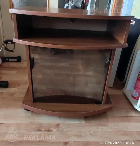TV galdiņs ar stikla plauktu,stikla durvīm ,uz riteņiem. Galdiņa izmēri 40x60,augstums ar riteņiem 65 cm.