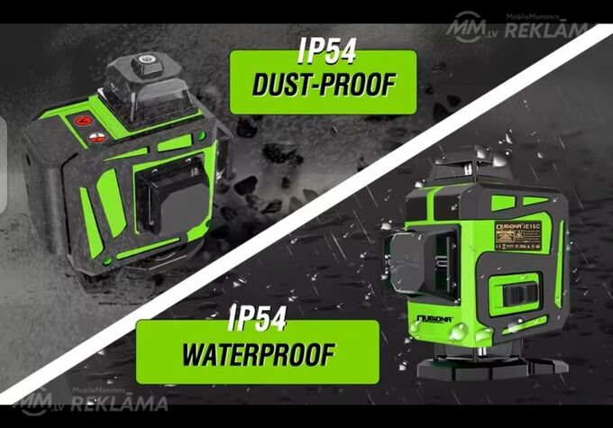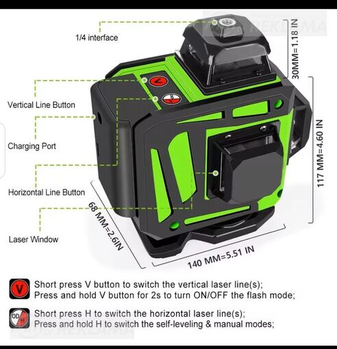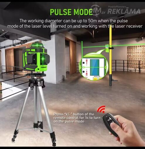 360 grādi, pašlīmeņošanās, skaņas signāls, novirzoties no horizontāles, tālvadības pults, zaļš stars.