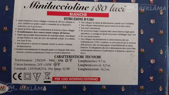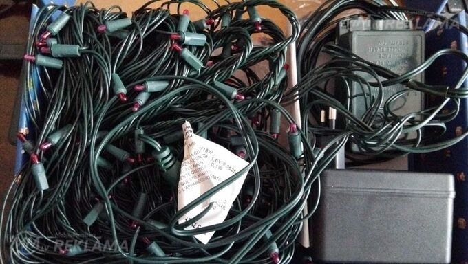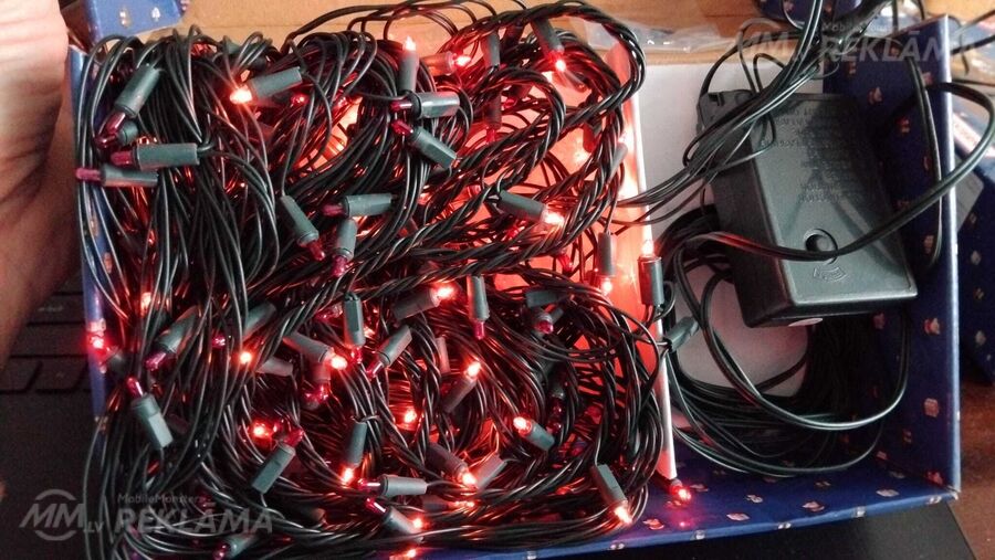 Продаю новую в упаковке электрическую световую белую и красную гирлянду.с180 лампочками. Прилагаются запасные лампочки Общая длина 16.2 метра, длина светящейся части лампочек 9,7 метра. Есть пульт для установки разных режимов мигания лампочек. Имеет восемь режимов мигания. Включается в сеть 220 вольт через адаптор. Длина провода от адаптора до лампочек 6,5 метра. можно использовать для украшения елок, деревьев,стен, окон и заборов. как внутри помещения, так и на улице. Цена 20 евро.