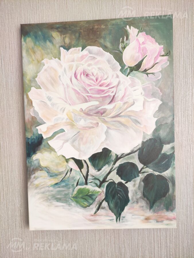 Кремовая роза с бутоном на холсте , цветочная живопись , аналог картины одного художника , края картины окрашены , покрыта глянцевым акриловым художественным лаком , в посылку с подрамником , доставка бесплатная