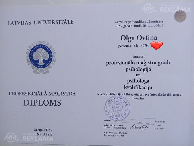Psihologu reģistrā esmu zem numura:3001518. Visi mani izglītību apliecinoši dokumenti ir pievienoti aprakstā.