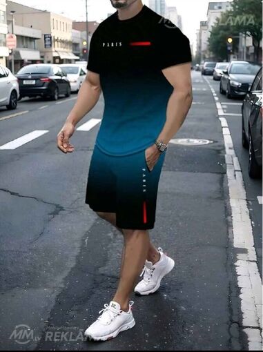 Viegls kostīms sportam vai atpūtai.Poliesters,šorti ar kabatām. Tops krūtīs 114 cm,garums 72 cm,šorti viduklī uz gumijas savelkami,nešķirojot 80 cm,gurnos 120 cm,garums 50 cm, šorti ar kabatām.Kostīms elastīgs.Sūtu .